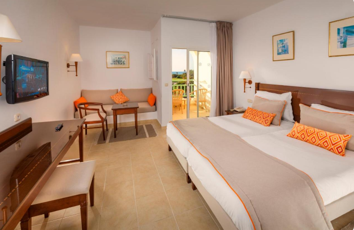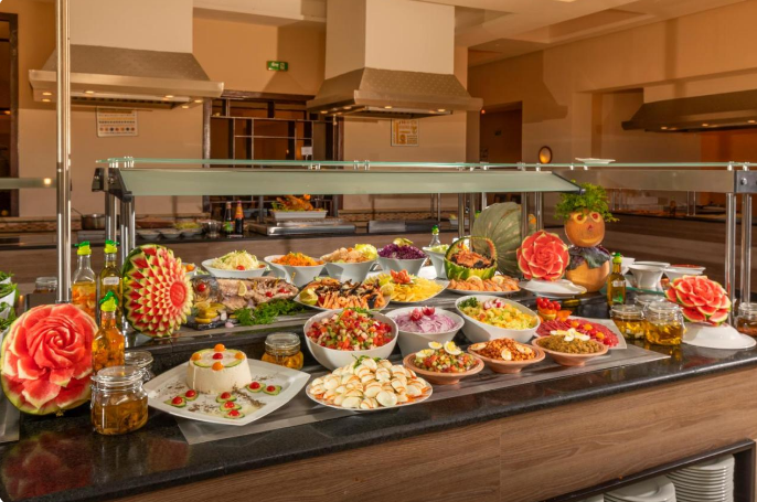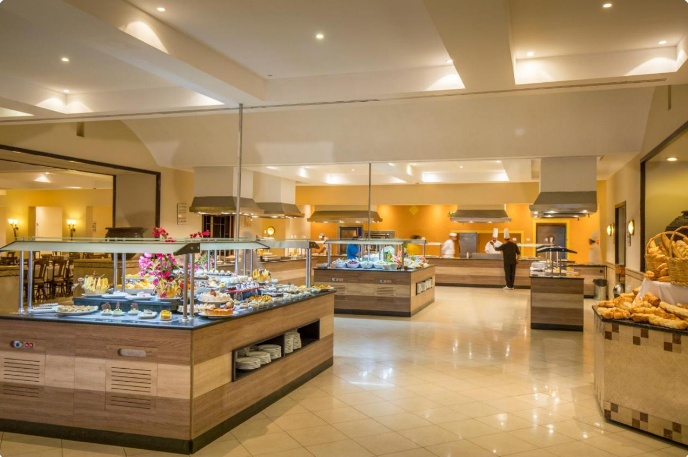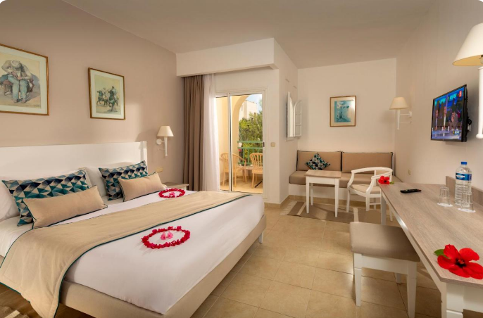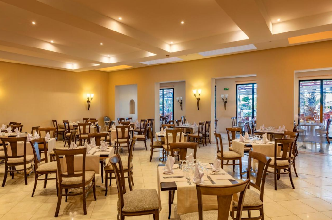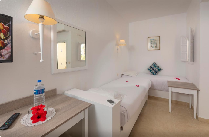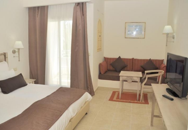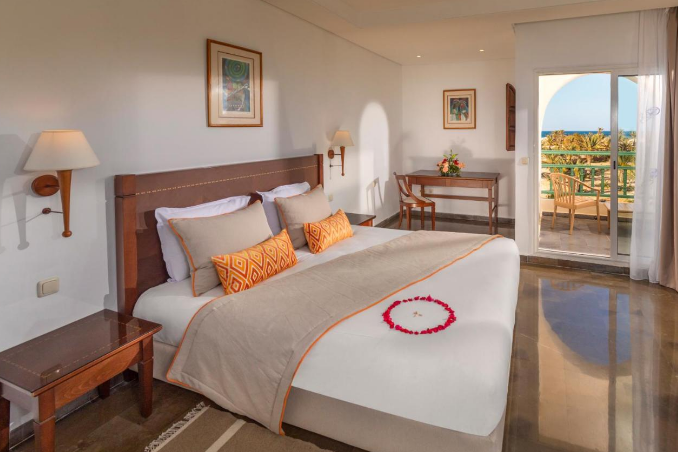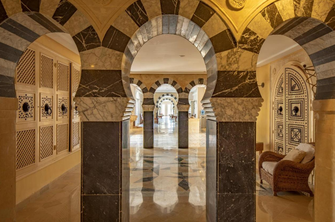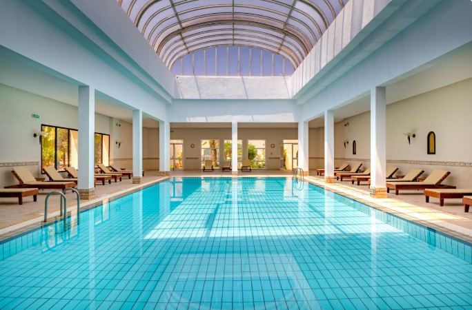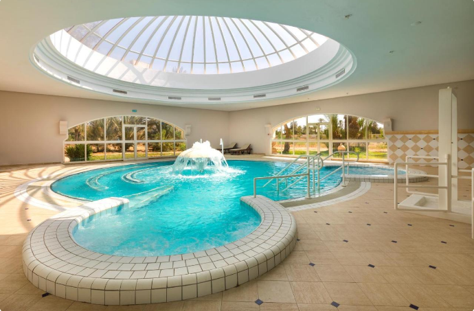 Installé sous une coupole, le lobby de marbre ne se débarque que par ses petits coins salons avec tapis et tables en bois, ses murs décorés de peintures contemporaines (dont des toiles de l'artiste tunisien Mahmoud Sehili) et ses baies vitrées ouvertes sur un jardin verdoyant de 14 hectares. Vous apprécierez lézarder à l'ombre des palmiers et des haies fleuries, au bord de la terrasse-solarium et de la vaste piscine de 50 m. En hiver, la piscine couverte sous verrière permet de nager à température clémente dans un bassin de 15 m de long. Notez que les transats et les serviettes de bain sont gratuits.